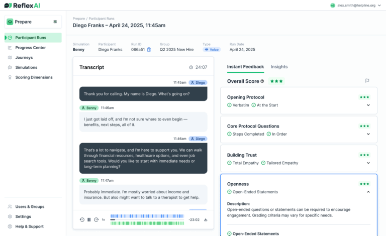 Lines for Life implemented ReflexAI’s new quality assurance platform, Assure, which transformed how they assess responder performance. Previously, they could only analyze 3% of calls, offering a limited view of overall performance. With Assure, they now have access to both quantitative and qualitative insights from all interactions, allowing for faster identification of areas for improvement and targeted skill development. This shift has empowered Lines for Life to enhance their service delivery and better support their responders.